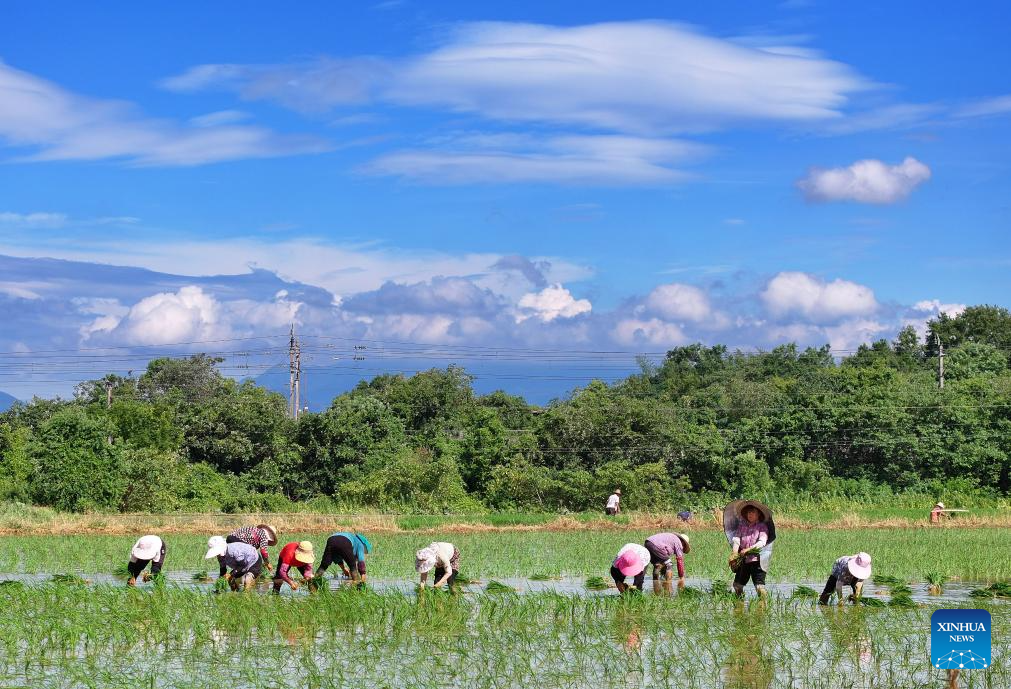 A drone photo taken on July 21, 2025 shows villagers transplanting rice seedlings in Hengyang, central China's Hunan province. Farmers across the country are busy with agricultural production in the farming season around Dashu, or the Great Heat, the 12th of traditional Chinese 24 solar terms falling on July 22 this year. (Photo by Cao Zhengping/Xinhua)