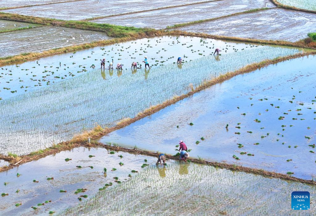 An aerial drone photo taken on July 21, 2025 shows villagers transplanting rice seedlings in Hengyang, central China's Hunan province. Farmers across the country are busy with agricultural production in the farming season around Dashu, or the Great Heat, the 12th of traditional Chinese 24 solar terms falling on July 22 this year. (Photo by Cao Zhengping/Xinhua)
