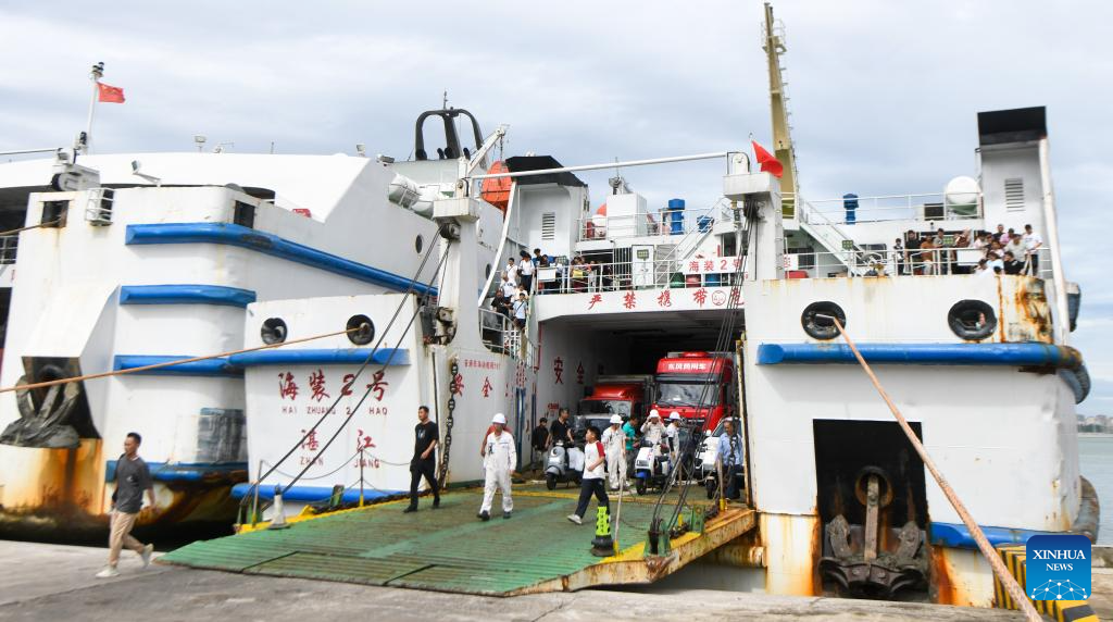Passengers disembark from a ferry ship at Xiuying Port in Haikou, south China's Hainan province, July 22, 2025. The passenger and freight ferry service in the Qiongzhou Strait has been resumed in an orderly manner as the impact of Typhoon Wipha weakens. (Xinhua/Yang Guanyu)