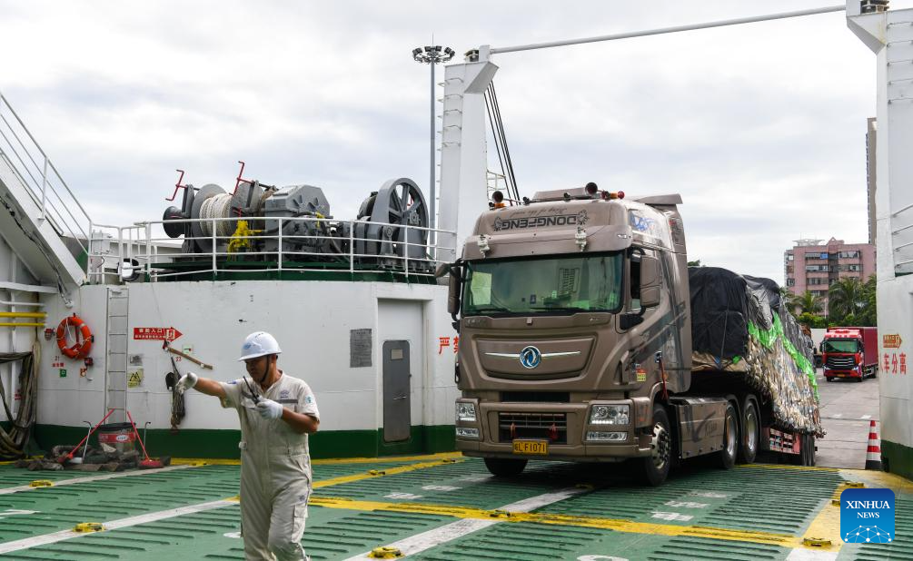 A truck drives into a ferry ship at Xiuying Port in Haikou, south China's Hainan province, July 22, 2025. The passenger and freight ferry service in the Qiongzhou Strait has been resumed in an orderly manner as the impact of Typhoon Wipha weakens. (Xinhua/Yang Guanyu)