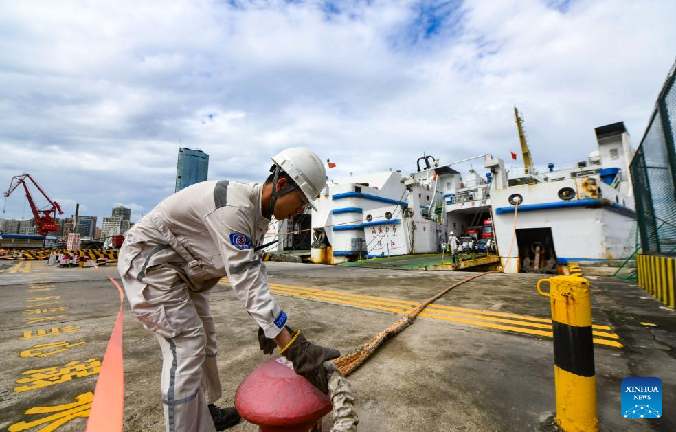 A staff member ties a mooring rope at Xiuying Port in Haikou, south China's Hainan province, July 22, 2025. The passenger and freight ferry service in the Qiongzhou Strait has been resumed in an orderly manner as the impact of Typhoon Wipha weakens. (Xinhua/Yang Guanyu)