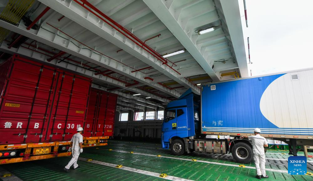 A truck drives into a ferry ship at Xiuying Port in Haikou, south China's Hainan province, July 22, 2025. The passenger and freight ferry service in the Qiongzhou Strait has been resumed in an orderly manner as the impact of Typhoon Wipha weakens. (Xinhua/Yang Guanyu)
