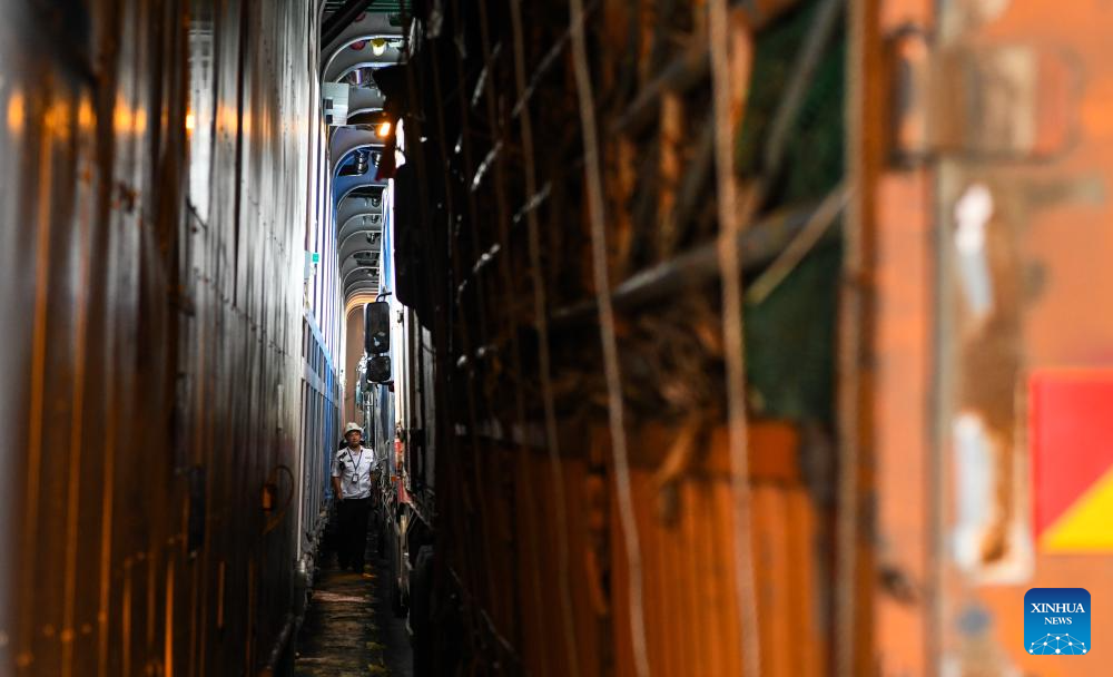 A maritime officer patrols on a ferry ship at Xiuying Port in Haikou, south China's Hainan province, July 22, 2025. The passenger and freight ferry service in the Qiongzhou Strait has been resumed in an orderly manner as the impact of Typhoon Wipha weakens. (Xinhua/Yang Guanyu)