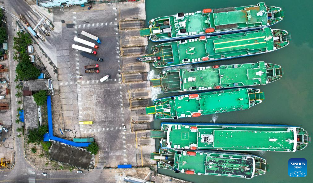 An aerial drone photo taken on July 22, 2025 shows trucks driving into ferry ships at Xiuying Port in Haikou, south China's Hainan province. The passenger and freight ferry service in the Qiongzhou Strait has been resumed in an orderly manner as the impact of Typhoon Wipha weakens. (Xinhua/Yang Guanyu)