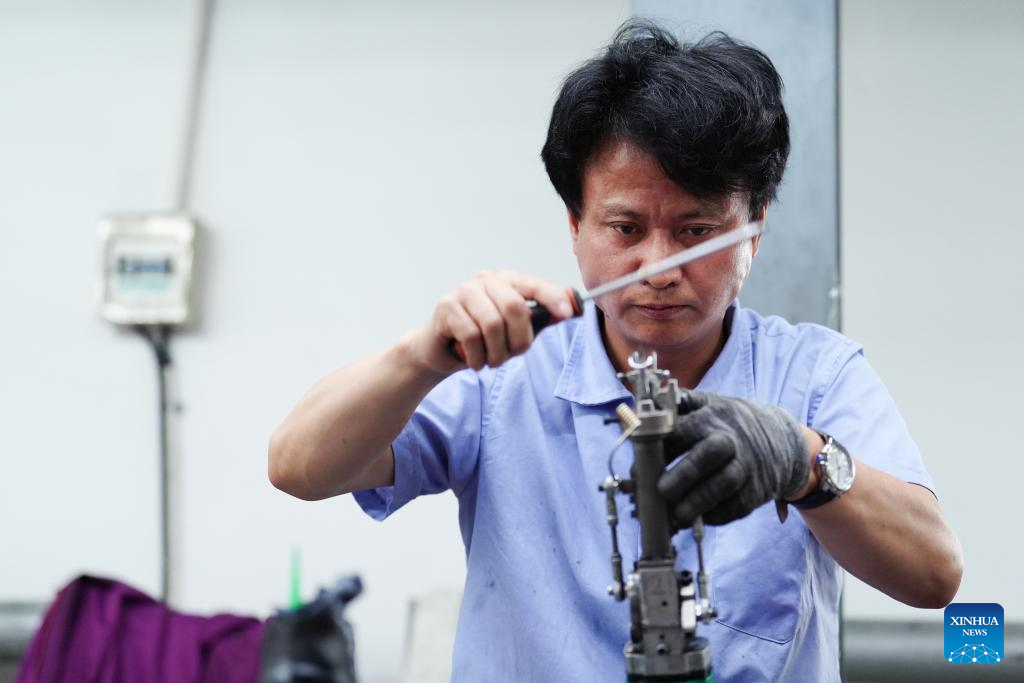 An employee checks a tool for the production of Tibetan carpet at a workshop of Shengyuan carpet group in Xining, northwest China's Qinghai Province, July 21, 2025. Located in Chengzhong District of Xining City, Shengyuan carpet group is an enterprise specializing in the design and production of Tibetan carpets. Since its establishment in 2007, the company has recruited people from surrounding areas, with 90% of its employees coming from nearby villages and including various ethnic minorities such as Tibetan and Tu ethnic groups.
