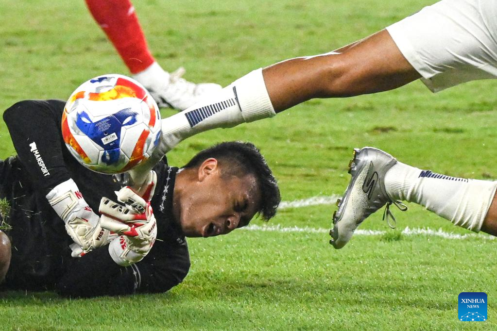 Muhammad Ardiansyah (L), goal keeper of Indonesia, competes during the ASEAN Football Federation (AFF) U23 Championship 2025 semifinal between Indonesia and Thailand in Jakarta, Indonesia, July 25, 2025. [Xinhua/Agung Kuncahya B.]