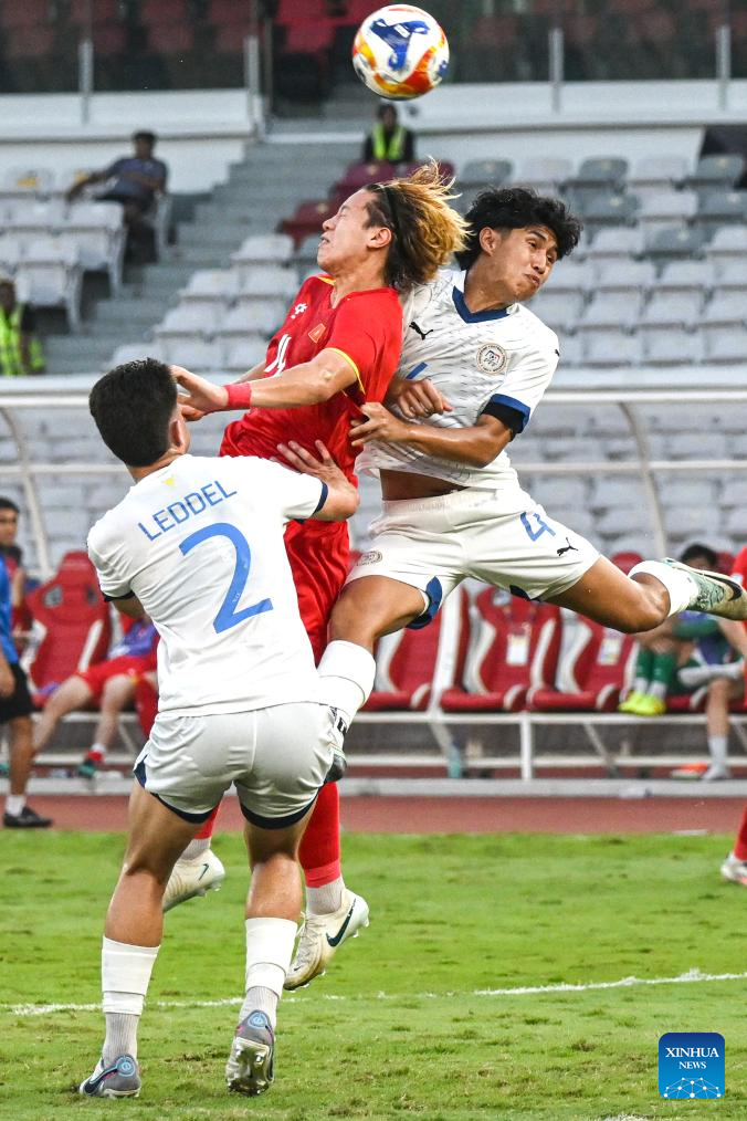 Viktor Le (C) of Vietnam vies for the ball during the ASEAN Football Federation (AFF) U23 Championship 2025 semifinal between Vietnam and the Philippines in Jakarta, Indonesia, July 25, 2025. [Xinhua/Agung Kuncahya B.]