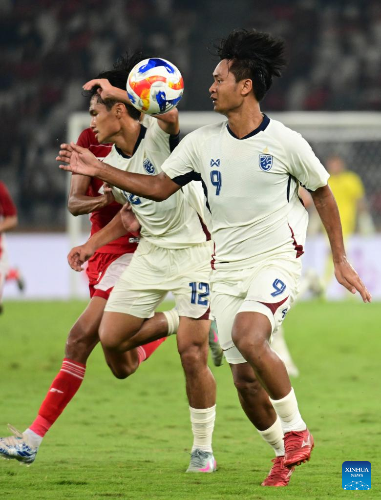 Yotsakon Burapha (R) of Thailand during the ASEAN Football Federation (AFF) U23 Championship 2025 semifinal between Indonesia and Thailand in Jakarta, Indonesia, July 25, 2025. [Xinhua/Zulkarnain]