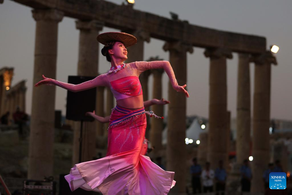 A dancer from China's North Minzu University performs at the 39th Jerash Festival of Culture and Arts in Jerash, Jordan, July 25, 2025. A traditional Chinese performance featuring dance, folk music, and ancient instruments took center stage on Friday at the 39th Jerash Festival of Culture and Arts. The performance, Colorful China, was staged by a 15-member troupe from North Minzu University in northwest China's Ningxia Hui Autonomous Region. The group presented a vibrant program of 13 pieces combining traditional music, ethnic dance, and instrumental art. [Photo by Mohammad Abu Ghosh/Xinhua]