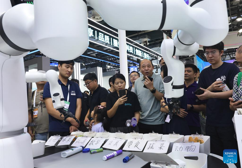 A robot demonstrates random item sorting through text recognition to visitors at the 2025 World AI Conference in east China's Shanghai, July 27, 2025. The ongoing 2025 World AI Conference showcases the world's latest AI advancements while providing a platform for visitors to access AI products and technologies. (Xinhua/Fang Zhe)
