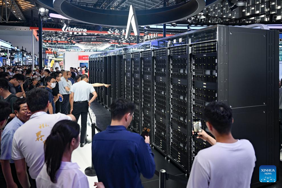 Visitors learn about Huawei's Ascend AI chip-based CloudMatrix 384 at the 2025 World AI Conference in east China's Shanghai, July 27, 2025. The ongoing 2025 World AI Conference showcases the world's latest AI advancements while providing a platform for visitors to access AI products and technologies. (Xinhua/Chen Haoming)