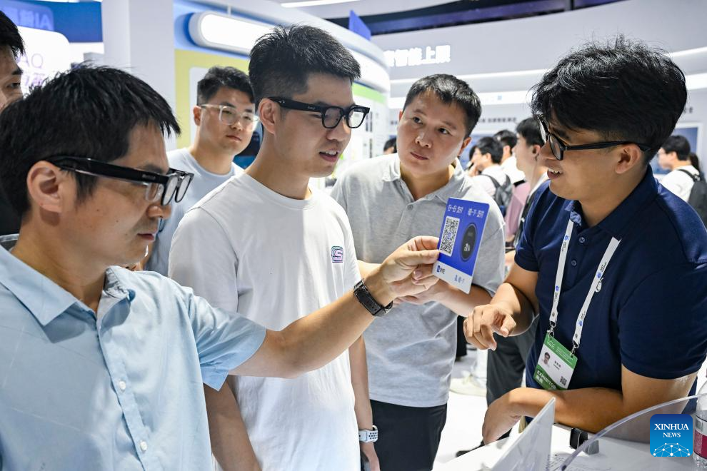 Visitors experience smart glasses with payment function at the 2025 World AI Conference in east China's Shanghai, July 27, 2025. The ongoing 2025 World AI Conference showcases the world's latest AI advancements while providing a platform for visitors to access AI products and technologies. (Xinhua/Chen Haoming)