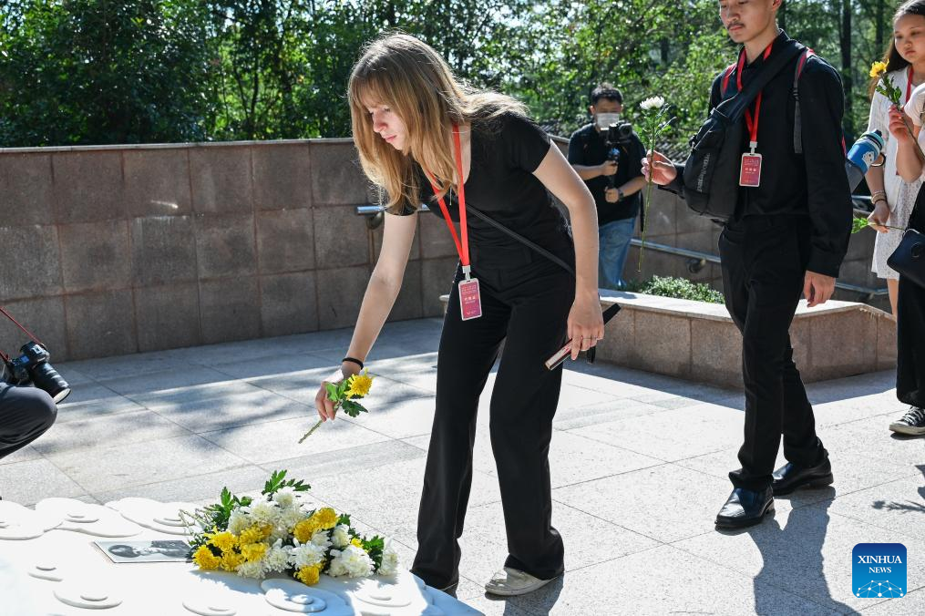 Students wait in line to lay flowers on the tombstone of U.S. Flying Tiger pilot Glen Beneda in Hong'an County of Huanggang City, central China's Hubei Province, July 28, 2025. (Xinhua/Du Zixuan)