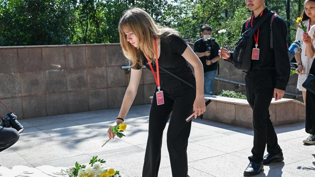 While visiting Hong'an, the student delegation laid chrysanthemums at the memorial site. Some were moved to tears while watching "Touching the Tigers," a documentary about Beneda's story.