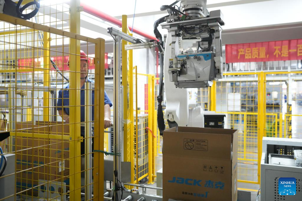 A robotic arm packs a product at a factory of Jack Technology Co., Ltd. in Taizhou Bay, Taizhou City, east China's Zhejiang Province, July 17, 2025. (Xinhua/Weng Xinyang)