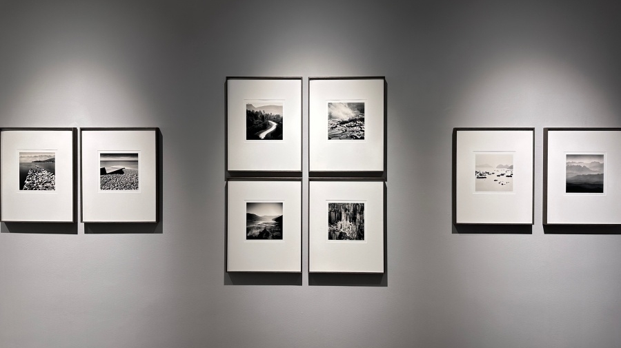The entrance to Michael Kenna's "Light Etchings" exhibition at KWM Art Center in Beijing, July 30, 2025. A large poster displays one of Kenna's signature monochrome landscapes featuring his distinctive interplay of light and shadow. [Photo by Liu Ziying/China.org.cn]
