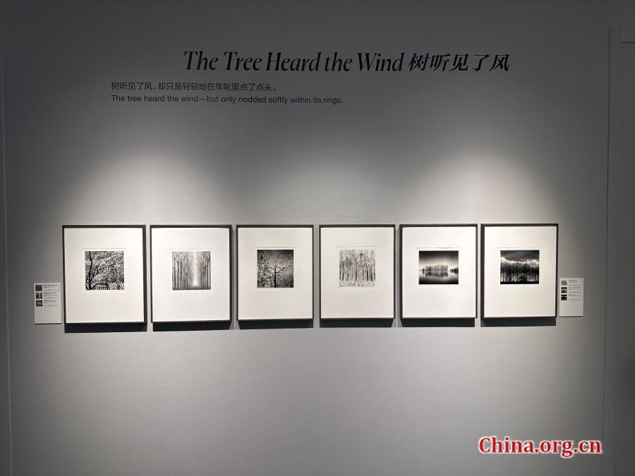 A wall titled "The Tree Heard the Wind" features Michael Kenna's work at the "Light Etchings" exhibition at KWM Art Center in Beijing, July 30, 2025. The tree, captured in long exposure, appears to respond to unseen forces in what serves as a metaphor for silent endurance and memory. [Photo by Liu Ziying/China.org.cn]