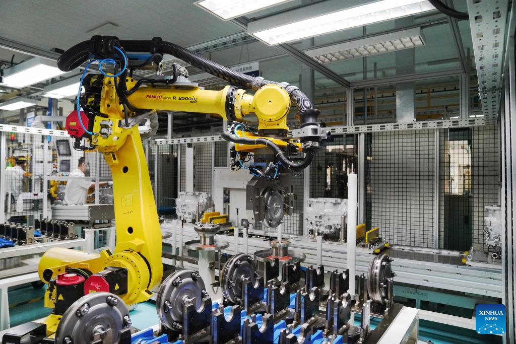 A robot is pictured on the production line at a workshop of Harbin Dongan Auto Engine Co., Ltd. in Harbin, northeast China's Heilongjiang Province, July 24, 2025. (Xinhua/Wang Song)