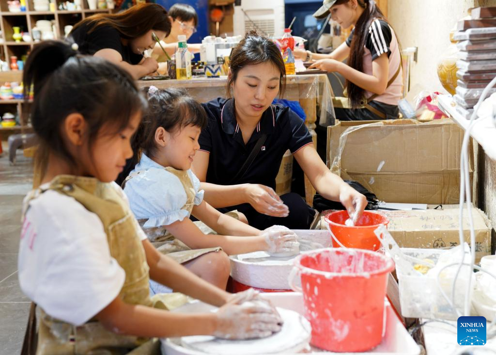 Children make pottery items in Yining City of Ili Kazak Autonomous Prefecture, northwest China's Xinjiang Uygur Autonomous Region, Aug. 4, 2025. Ili Kazak Autonomous Prefecture has ushered in its peak tourism period. The region's unique natural landscapes and cultural sites have attracted a large number of visitors. It received 54.93 million domestic tourists in the first seven months of this year, a year-on-year increase of 10.31 percent. (Xinhua/Liu Lianfen)
