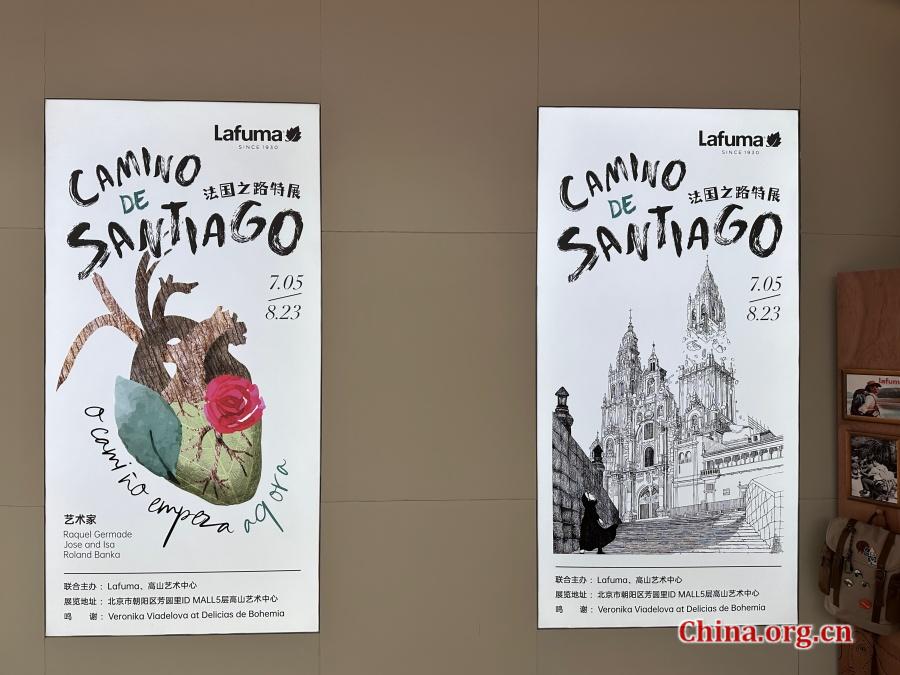 The entrance to the "Camino de Santiago: The Road of France" exhibition at the High Mountain Art Center in Beijing, Aug. 4, 2025. Large illustrated posters welcome visitors to explore the pilgrimage's physical and spiritual aspects. [Photo by Liu Ziying/China.org.cn]
