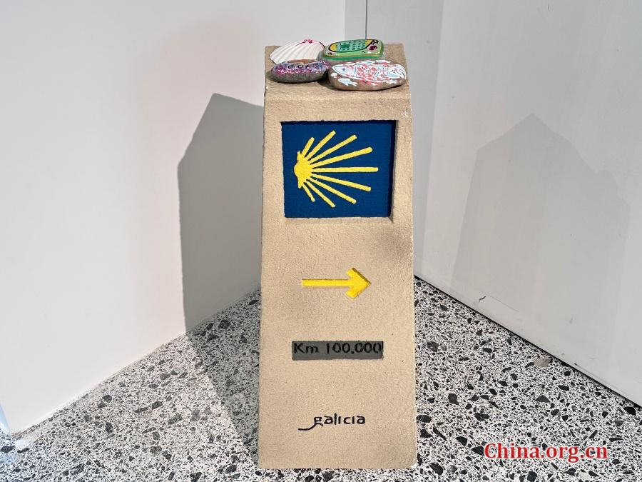 A pilgrim's milestone with directional signs and shell carvings is displayed at the "Camino de Santiago: The Road of France" exhibition at the High Mountain Art Center in Beijing, Aug. 4, 2025. Such stones are placed along the trail to help pilgrims navigate and track how far they have traveled. [Photo by Liu Ziying/China.org.cn]