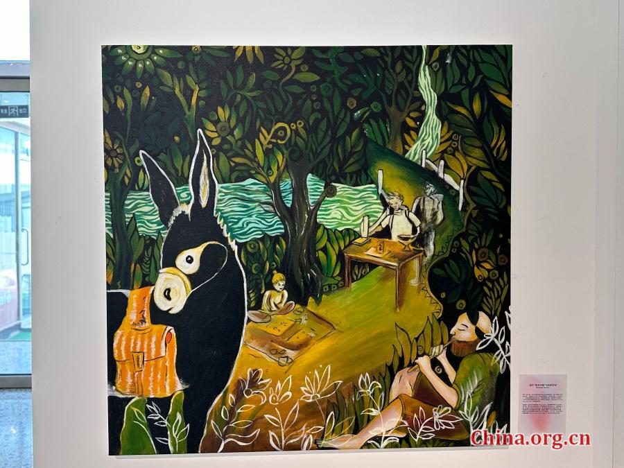 Roland Banka's self-portrait "Modern Don Quixote with His Donkey" is displayed at the "Camino de Santiago: The Road of France" exhibition at the High Mountain Art Center in Beijing, Aug. 4, 2025. A language and philosophy teacher turned pilgrim, Banka's journeys fuse absurdity with devotion, highlighting the Camino's existential dimension. [Photo by Liu Ziying/China.org.cn]