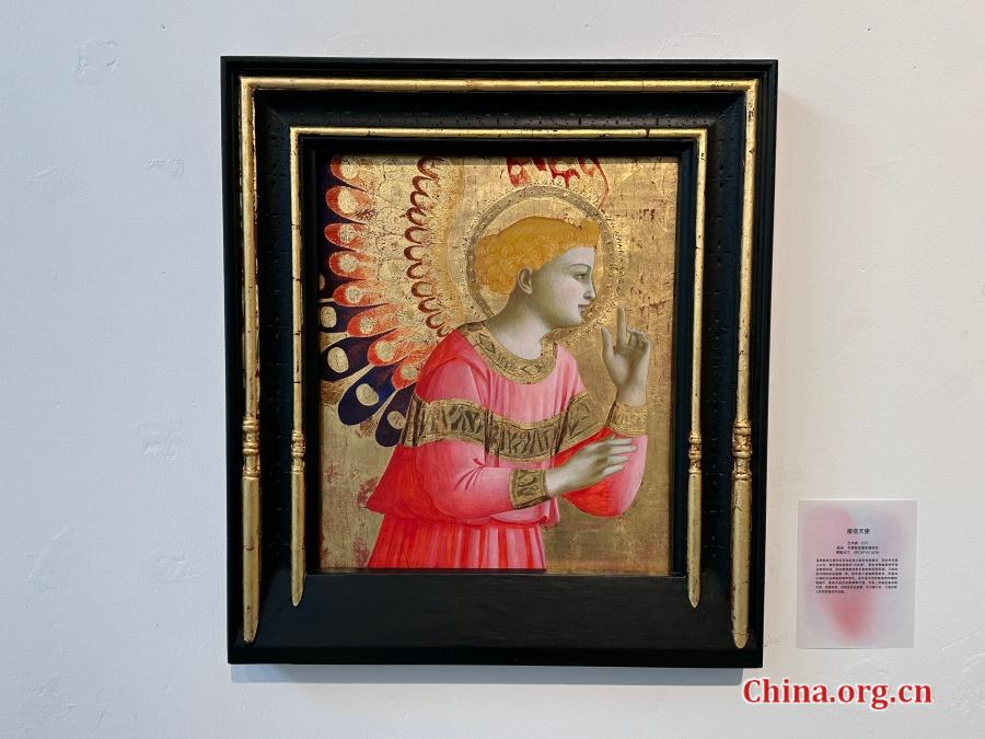 The artwork "Annunciation Angel" by artist Xing Xing is displayed at the "Camino de Santiago: The Road of France" exhibition at the High Mountain Art Center in Beijing, Aug. 4, 2025. While not a traditional Camino symbol, the angel represents the inner voice that calls people to begin their spiritual journey. [Photo by Liu Ziying/China.org.cn]