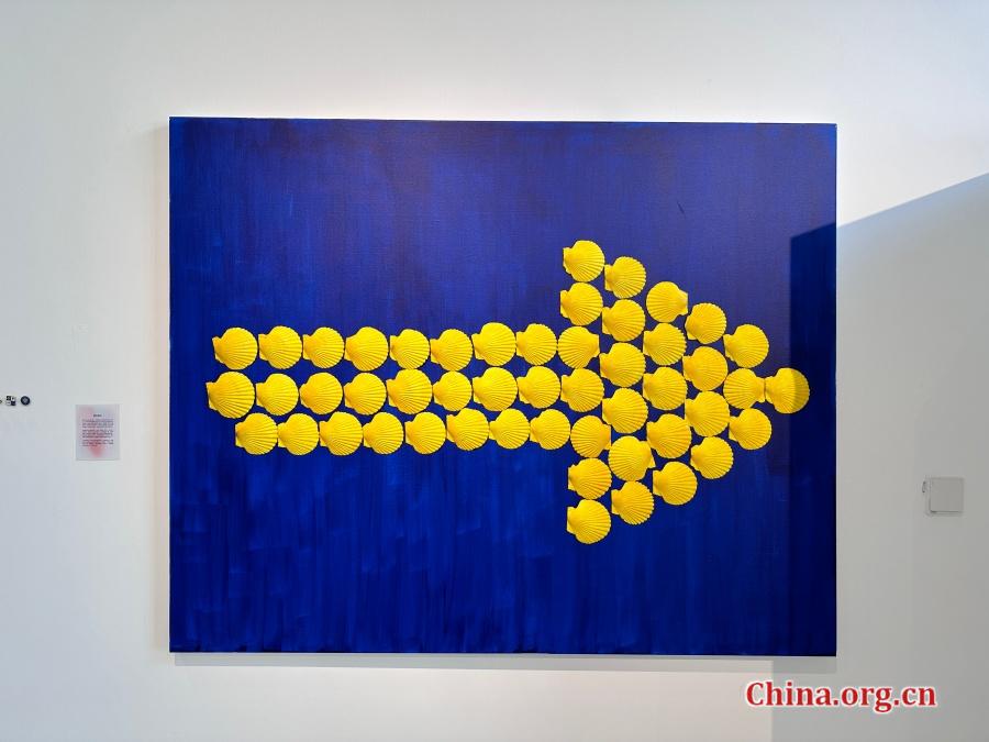 A display dedicated to the Camino's iconic yellow arrows is shown at the "Camino de Santiago: The Road of France" exhibition at the High Mountain Art Center in Beijing, Aug. 4, 2025. Originally painted by Galician priest Elias Valiña in the 1980s, these yellow arrows now guide thousands of pilgrims along the route. [Photo by Liu Ziying/China.org.cn]