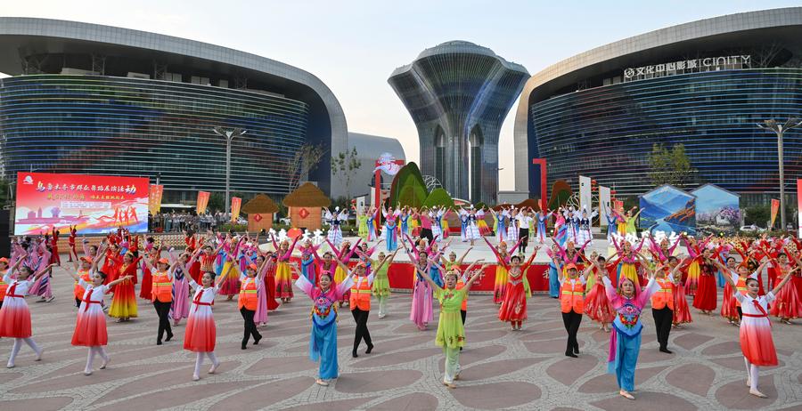 Dancers perform during the "Our Village Dance" square dance competition at the cultural park in Urumqi, northwest China's Xinjiang Uygur Autonomous Region, July 28, 2025. [Photo/Xinhua]