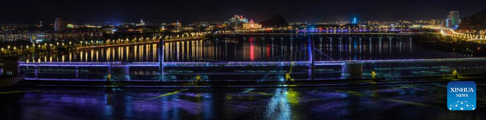 A stitched panoramic aerial drone photo taken on July 30, 2025 shows bridges over the Lhasa River in Lhasa, southwest China's Xizang Autonomous Region. During the 1950s, the first bridge over the Lhasa River was built, ending the reliance on sheepskin rafts for river crossings. Nowadays, multiple bridges span the river across downtown Lhasa, reflecting the region's rapid progress in transportation and urban development. (Xinhua/Jiang Fan)