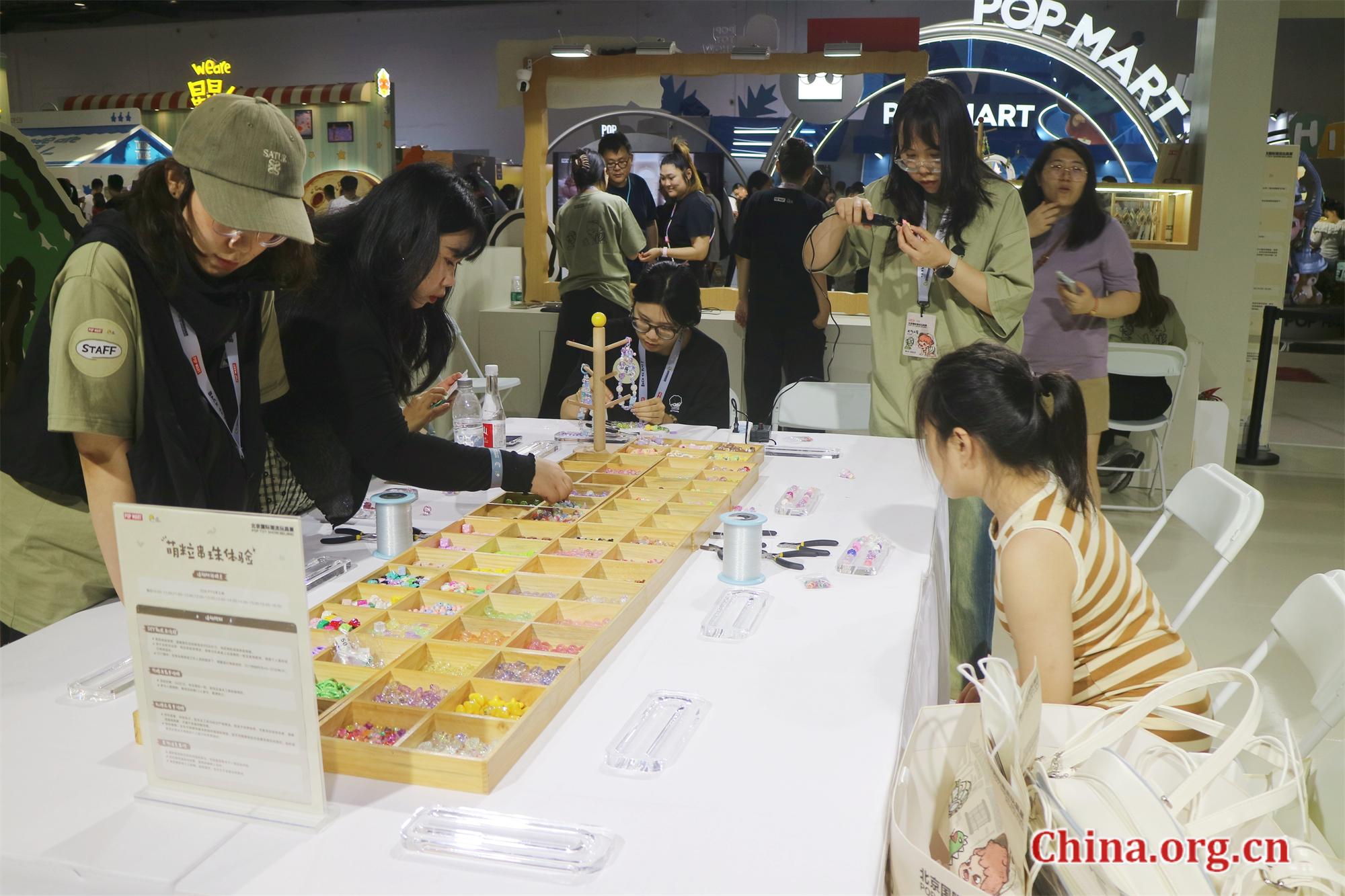 Visitors take part in a bead stringing activity during the 2025 PTS in Beijing, Aug. 1, 2025. For a small fee, attendees could create their own handmade crafts, such as hot-stamped leather goods and DIY photo frames. [Photo by Li Congrong/China.org.cn]