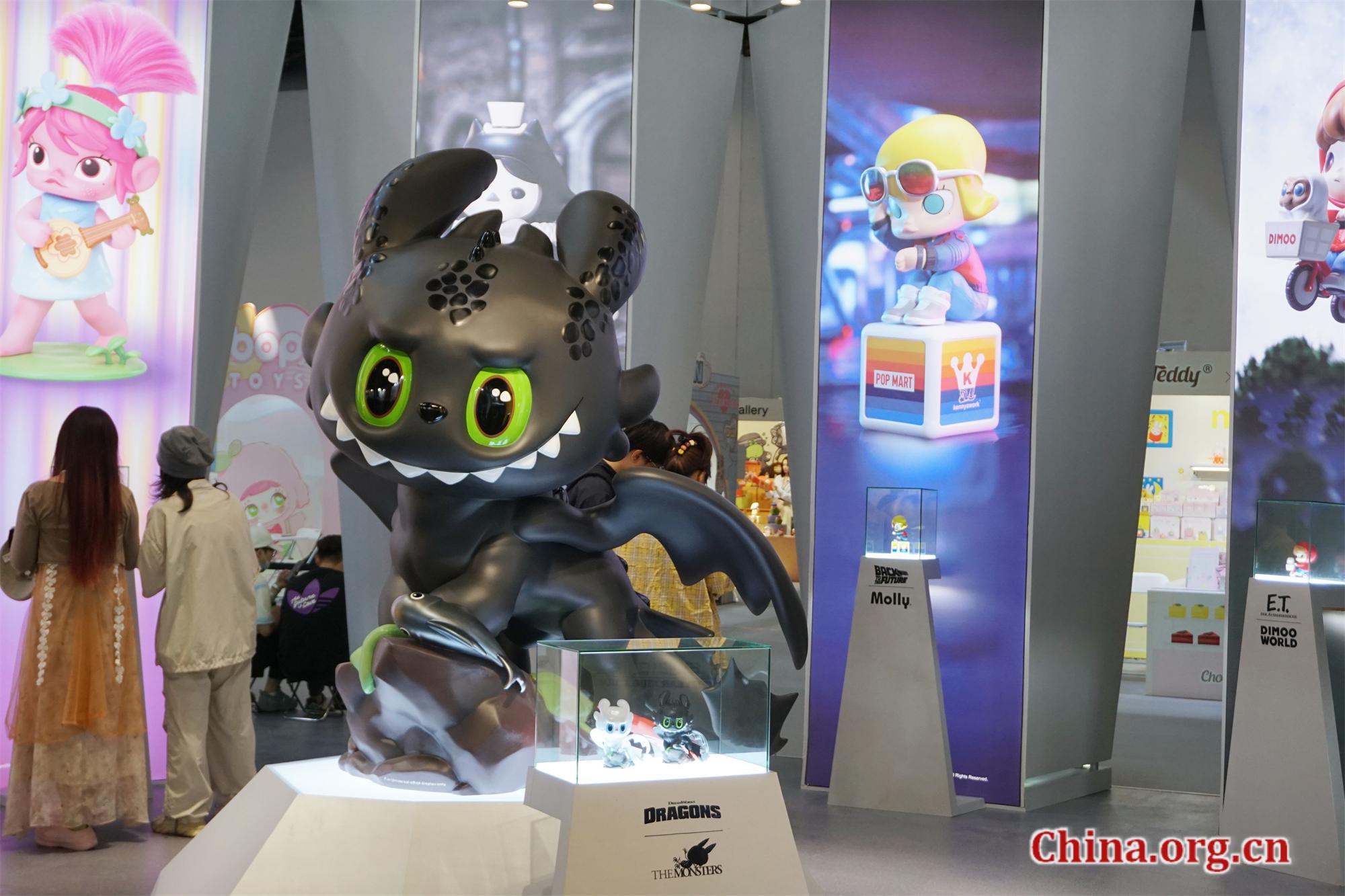 A large co-branded doll model combining Labubu and the character Toothless from "How to Train Your Dragon" on display in the Universal Products & Experiences section of the 2025 PTS in Beijing, Aug. 1, 2025. The event attracted internationally renowned toy brands including Universal and Bandai Namco. [Photo by You Jiaxin/China.org.cn]
