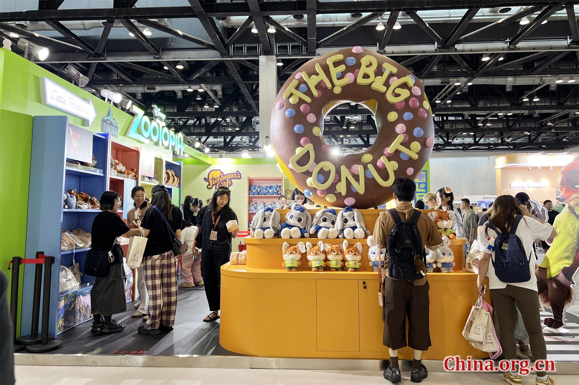 A giant donut model on display in the "Zootopia"-themed pop-up store at the 2025 PTS in Beijing, Aug. 1, 2025. Visitors could purchase dolls and other merchandise featuring characters from "Zootopia" and "Lilo & Stitch." [Photo by Li Congrong/China.org.cn]