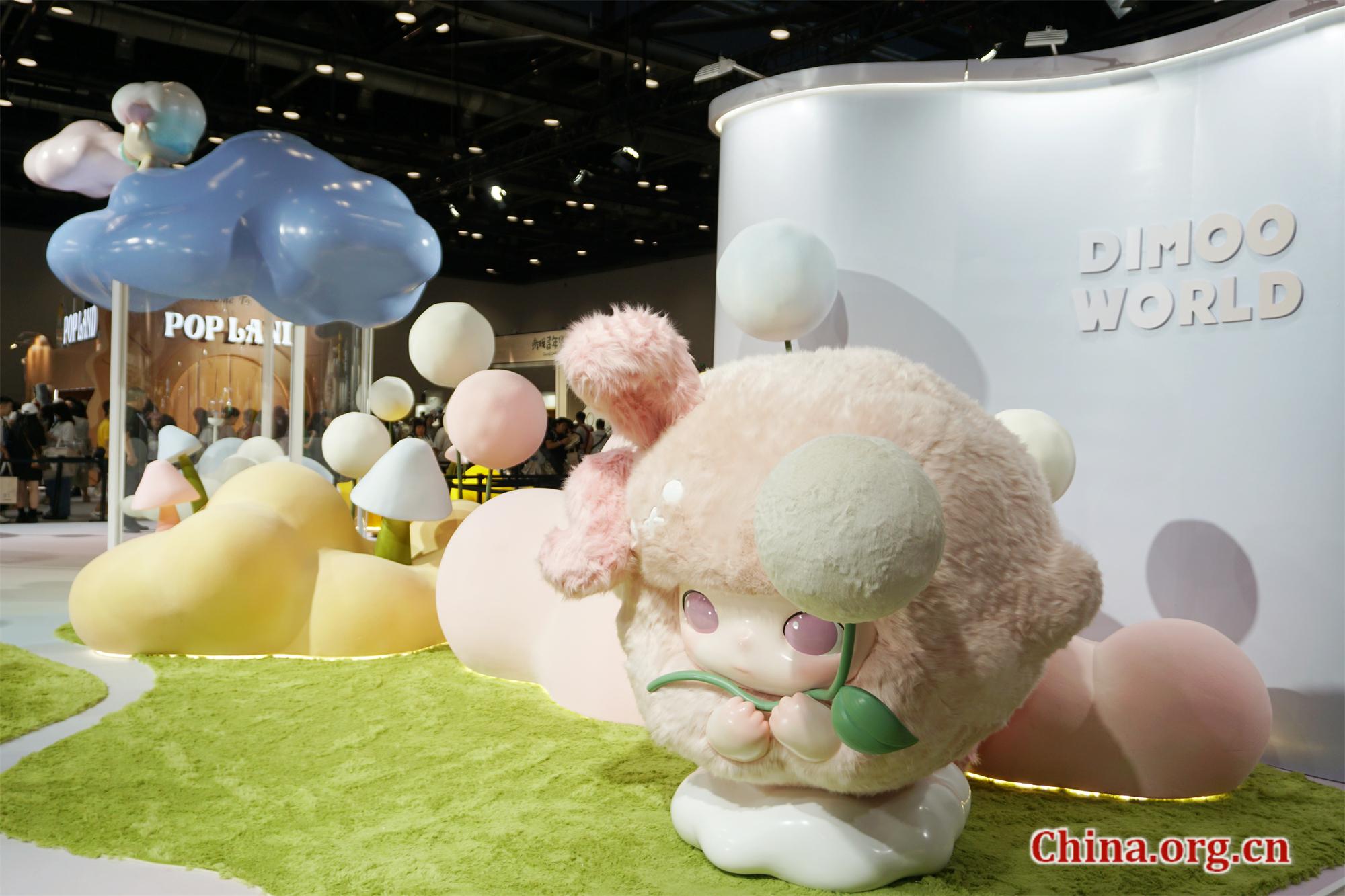 The Dimoo World booth at the 2025 PTS in Beijing, Aug. 1, 2025. A display featuring a giant plush Dimoo holding flowers, alongside clouds, mushrooms and other fairy tale elements, created a whimsical setting that highlighted the IP's unique appeal. [Photo by You Jiaxin/China.org.cn]
