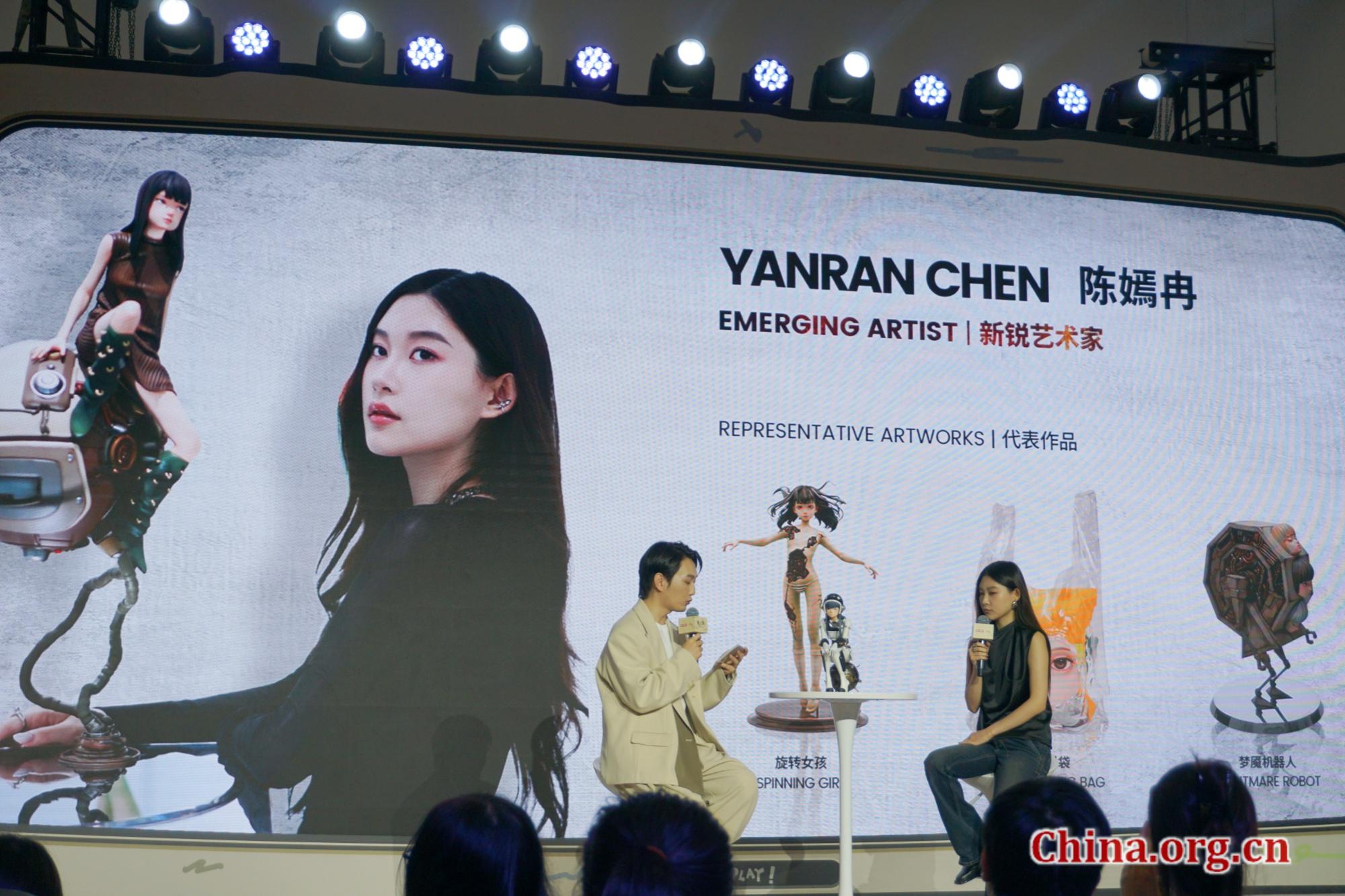 Artist Chen Yanran discusses her latest IP creations during an interview at the 2025 PTS in Beijing, Aug. 1, 2025. She explained that KeyA, as a hybrid of machinery and femininity, is designed not as a functional entity, but as an extension of free will — representing a fluid, ever-changing state of being. The series continues her exploration of bodily and systemic tension, while also reflecting a bold vision of future human forms. [Photo by You Jiaxin/China.org.cn]
