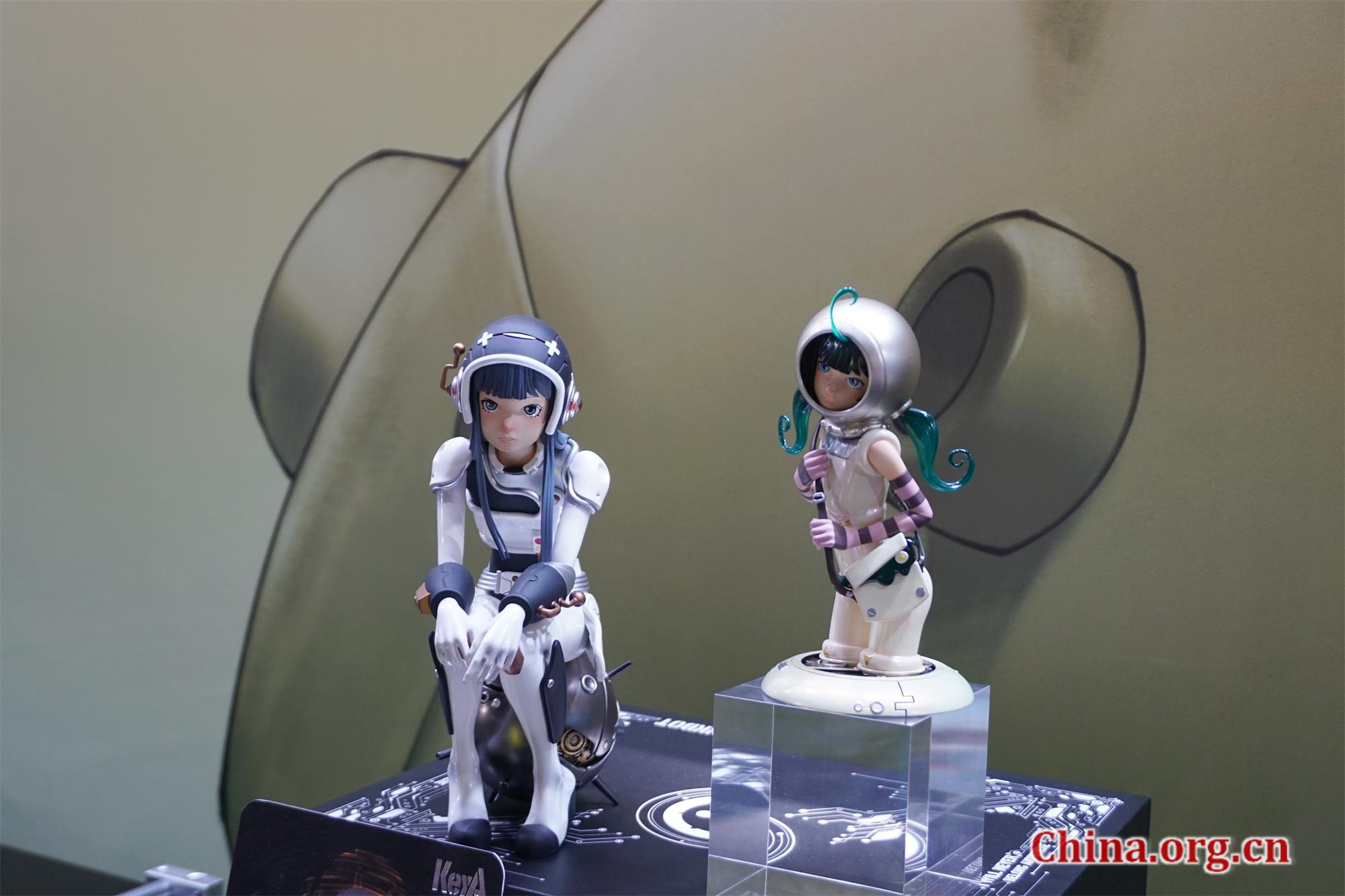 Figures from Chen Yanran's futuristic KeyA series on display at the 2025 PTS in Beijing, Aug. 1, 2025. Showcasing Chen's unique biomechanical aesthetics and futuristic design, the figures were a big hit with visitors. [Photo by You Jiaxin/China.org.cn]