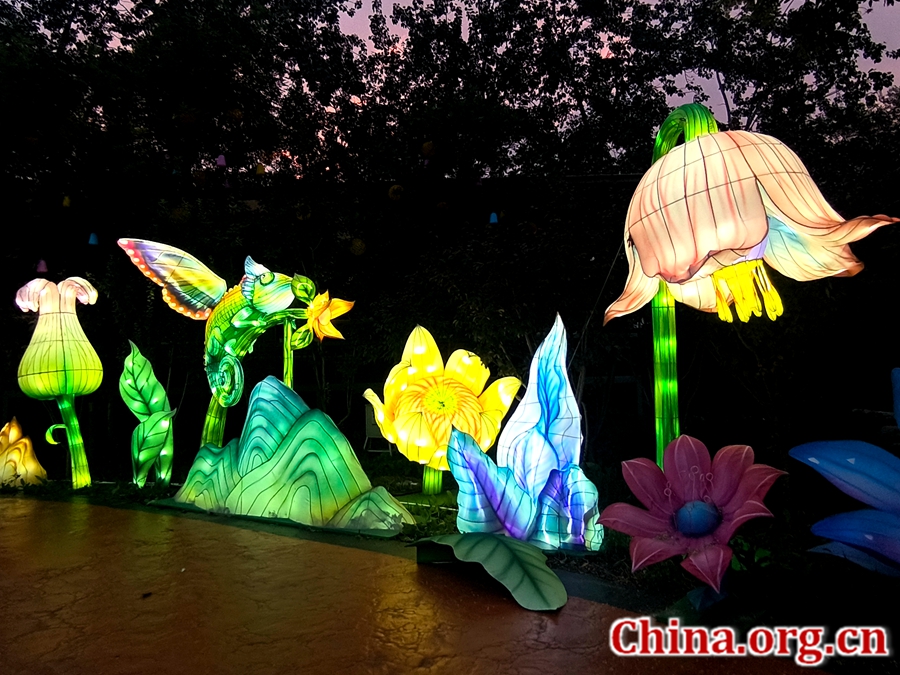 A lantern display depicting flowers and a chameleon at Shijingshan Amusement Park in Beijing, Aug. 5, 2025. [Photo by Xu Xiaoxuan/China.org.cn]