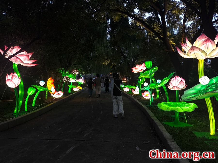 Visitors walk along a path lined with lotus-shaped lanterns at Shijingshan Amusement Park in Beijing, Aug. 5, 2025. [Photo by Xu Xiaoxuan/China.org.cn]