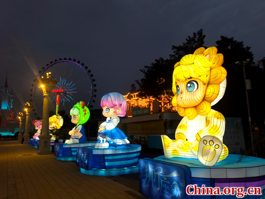 Cartoon figure lanterns depicting the star signs at Shijingshan Amusement Park in Beijing, Aug. 5, 2025. [Photo by Xu Xiaoxuan/China.org.cn]