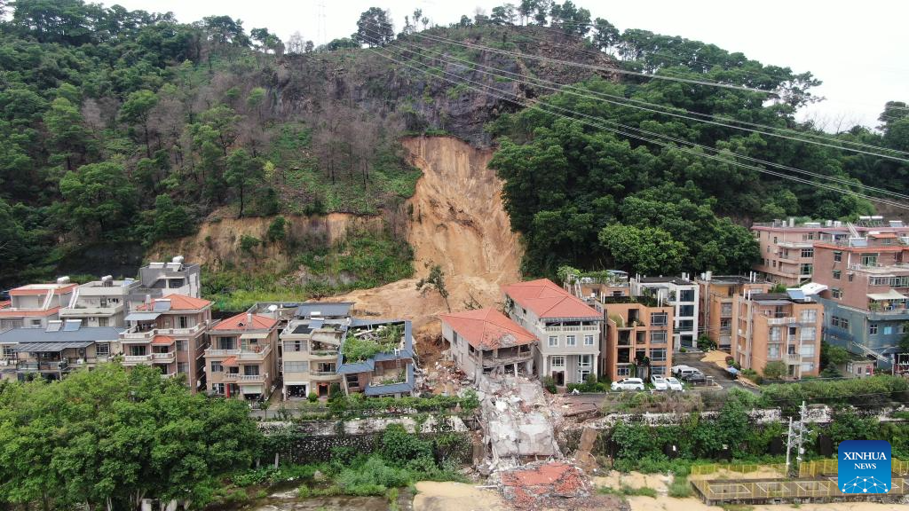 An aerial drone photo taken on Aug. 6, 2025 shows the site of a rain-triggered landslide at Dayuan Village, Baiyun District of Guangzhou, south China's Guangdong Province. [Photo/Xinhua]