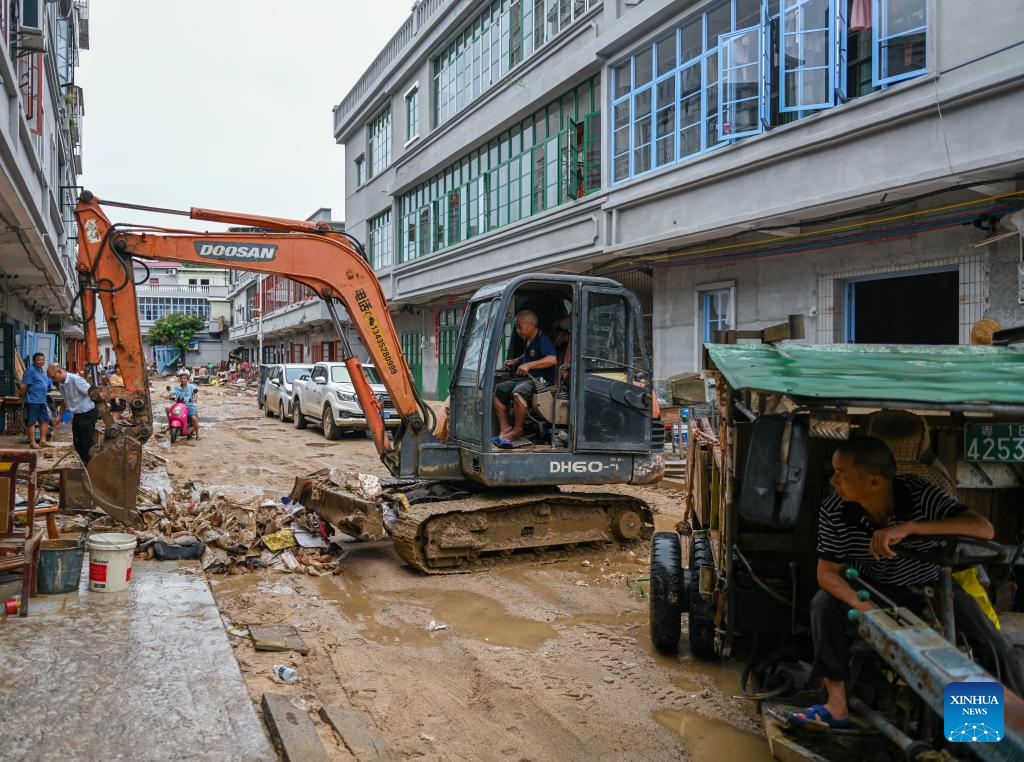 A man drives an excavator to clear silt and debris in Huanghua Village of Qingyuan City, south China's Guangdong Province, Aug. 6, 2025. [Photo/Xinhua]