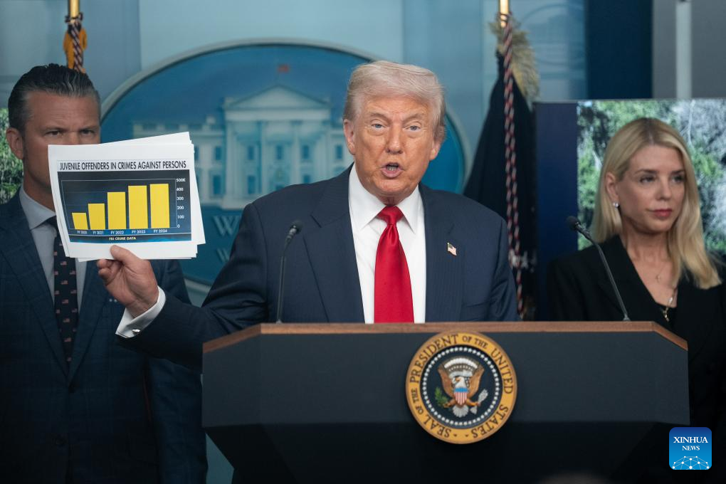 U.S. President Donald Trump (C) speaks during a press conference at the White House in Washington, D.C., the United States, on Aug. 11, 2025. [Photo/Xinhua]