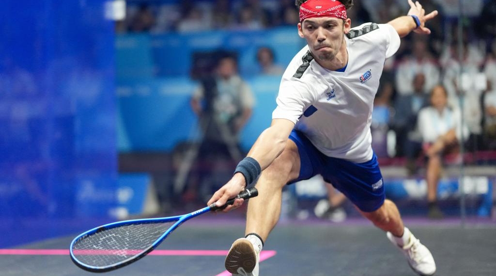 Victor Crouin competes during the Men's Singles Finals Gold Medal Match between Victor Crouin of France and Balazs Farkas of Hungary of Squash event at The World Games 2025 in Chengdu, southwest China's Sichuan Province, Aug. 12, 2025. (Xinhua/Li Xulun)
