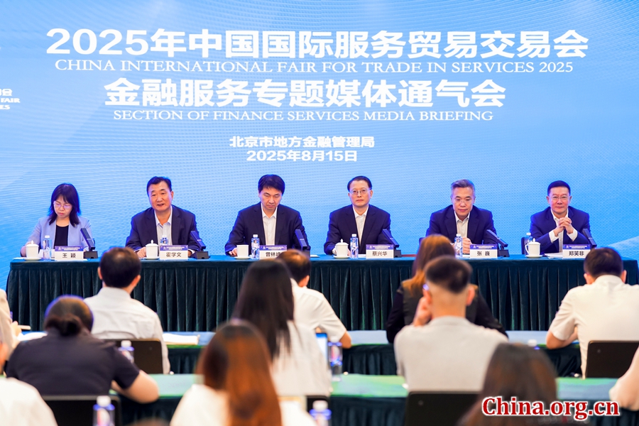 Officials and financial institution executives attend a press conference in Beijing to introduce highlights and plans for the upcoming 2025 China International Fair for Trade in Services (CIFTIS) Section of Finance Services, Aug. 15, 2025. [Photo/China.org.cn]