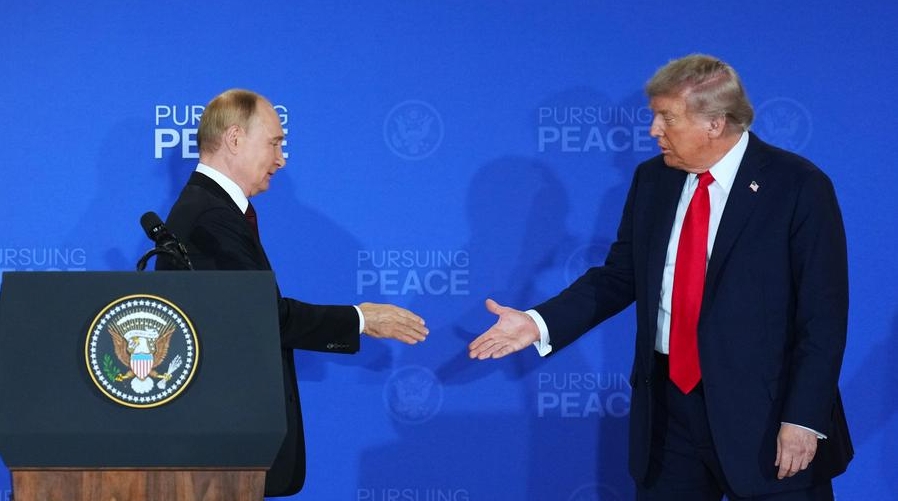 U.S. President Donald Trump (R) and Russian President Vladimir Putin attend a joint press conference after concluding their talks in Anchorage, Alaska, the United States, on Aug. 15, 2025. [Photo/Xinhua]