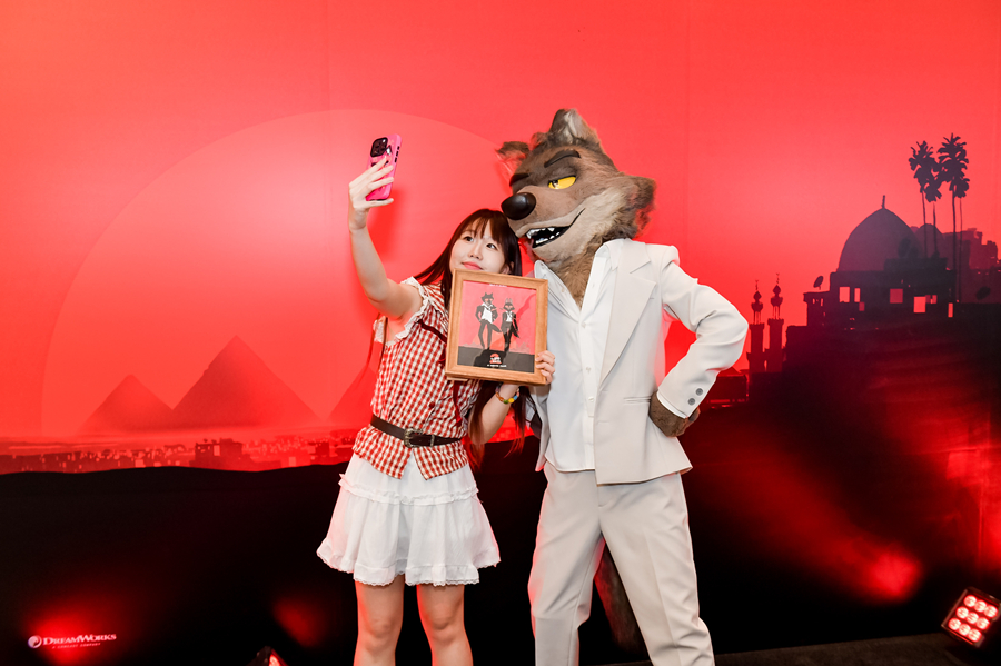 A performer dressed as Mr. Wolf poses with an audience member at the China premiere of "The Bad Guys 2" in Beijing, Aug. 11, 2025. [Photo courtesy of Universal Pictures]