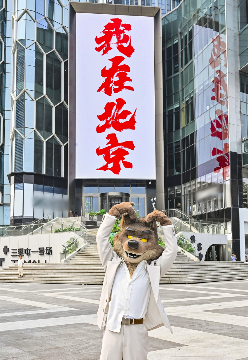 A performer dressed as Mr. Wolf poses for photos with a big screen reading "I'm in Beijing" at the Sanlitun shopping complex in Beijing before the China premiere of "The Bad Guys 2," Aug. 11, 2025. [Photo courtesy of Universal Pictures]