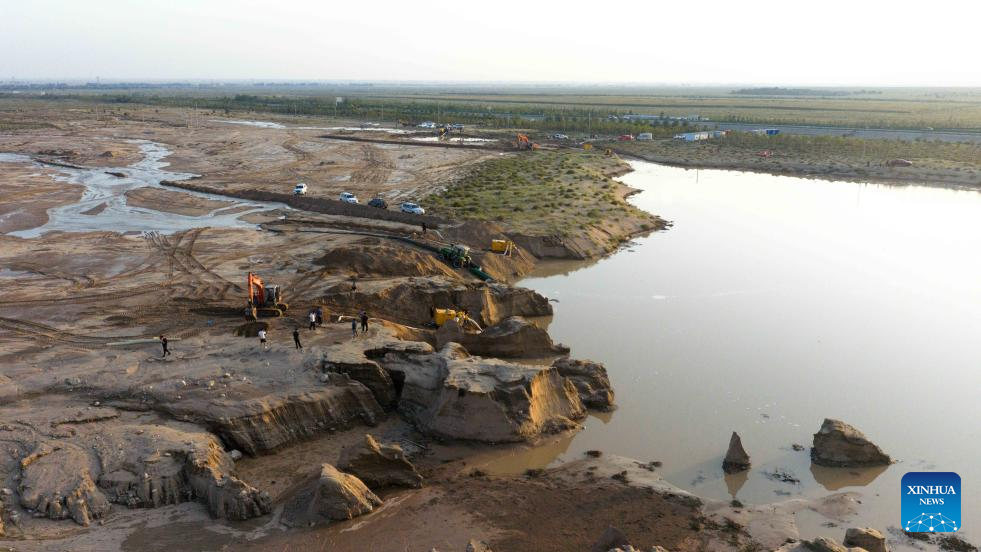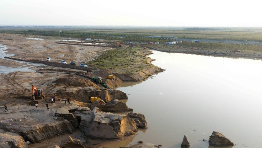 An aerial drone photo taken on Aug. 17, 2025 shows rescuers searching for missing individuals in Urad Rear Banner of Bayannur City, north China's Inner Mongolia Autonomous Region. [Photo/Xinhua]