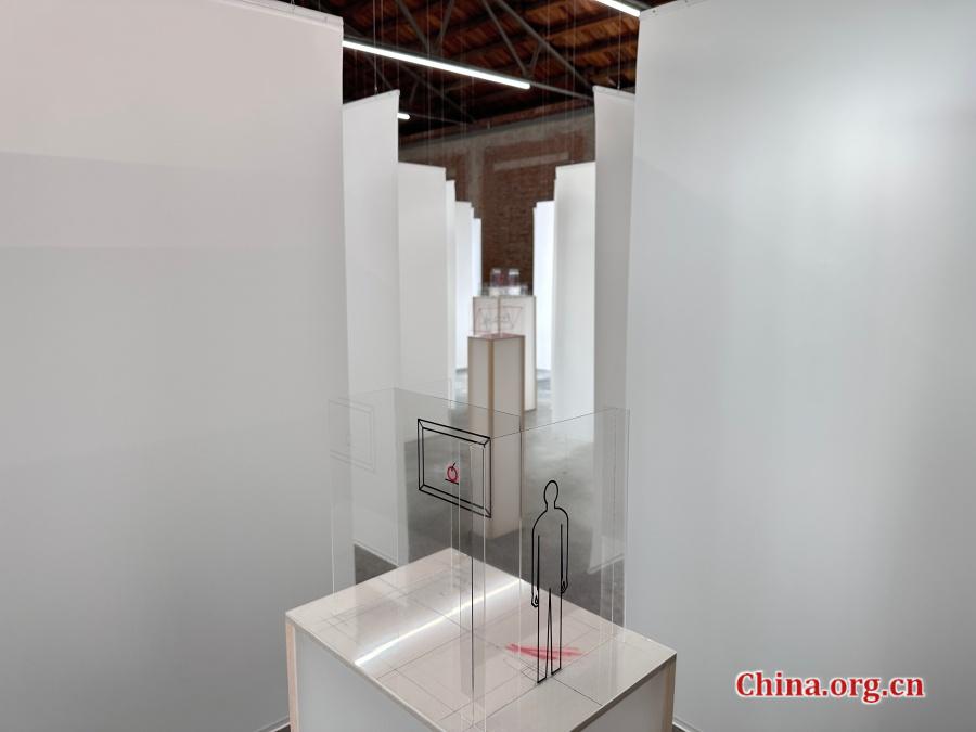 "Two-Dimensional Transparent Sculpture" is shown at Beijing Commune, Aug. 14, 2025. The show features works by Wang Luyan installed in a former factory space with white partitions creating rhythm between the pieces. [Photo by Liu Ziying/China.org.cn]