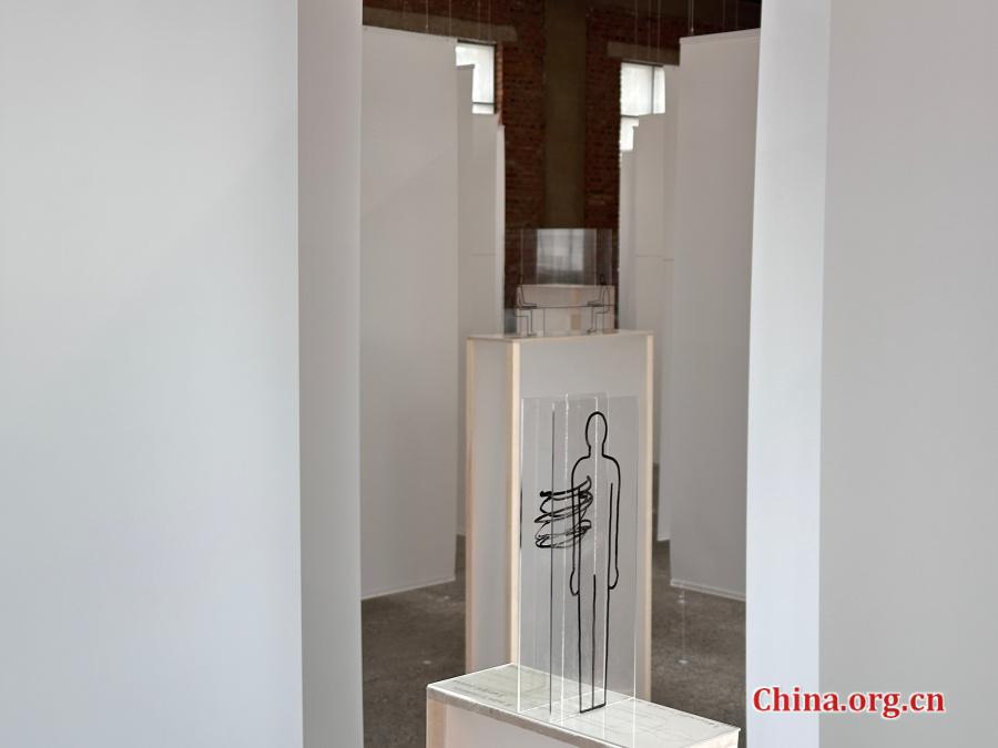 A human silhouette with spiral black lines is shown in "Two-Dimensional Transparent Sculpture" at Beijing Commune, Aug. 14, 2025. The lines appear embedded within the body from one view but float outside the figure when seen from the side. [Photo by Liu Ziying/China.org.cn]